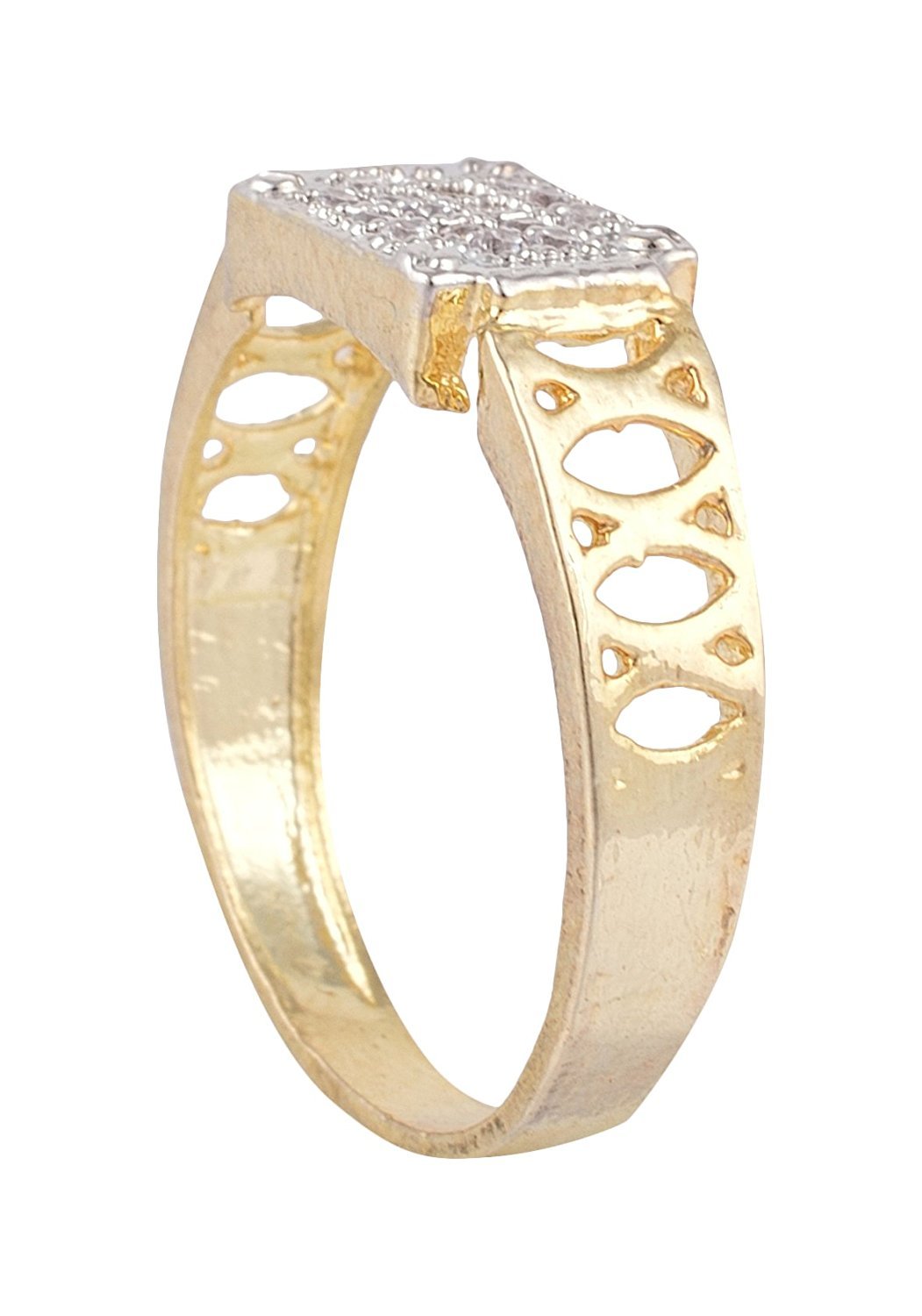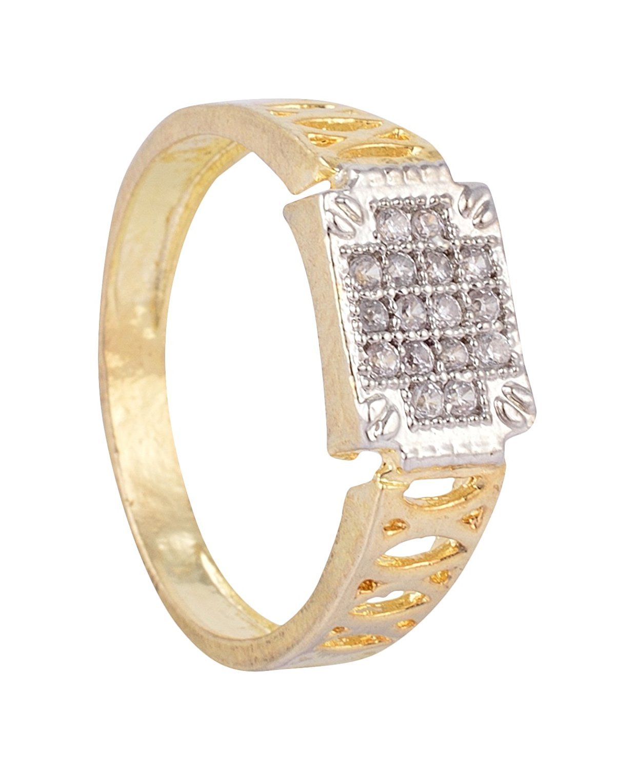 Make a bold style statement with this Gold and Silver Plated American Diamond Alloy Ring for Men, designed to reflect confidence and refined taste. Crafted from durable alloy, this ring features a striking dual-tone gold and silver plating that adds a luxurious finish, while the finely set American diamonds deliver brilliant sparkle without being overpowering. Its sleek yet masculine design makes it perfect for both everyday wear and special occasions, pairing effortlessly with ethnic or western outfits. Comfortable to wear and built to last, this ring is an ideal choice for men who appreciate modern elegance with a touch of timeless shine.